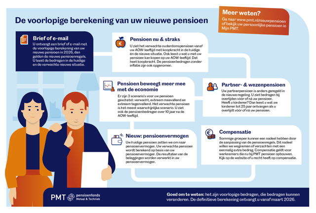 De brief met de voorlopige berekening van uw pensioen in 2026 is samengevat op 1 pagina. U ziet de belangrijkste onderwerpen met een korte toelichting. Uw persoonlijke bedragen vindt u in de brief of e-mail die u van ons ontvangt in oktober of november of kijk in Mijn PMT.