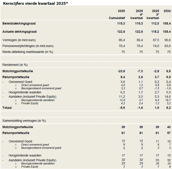 - Beleidsdekkingsgraad per 31 december 2025: 115,3%
