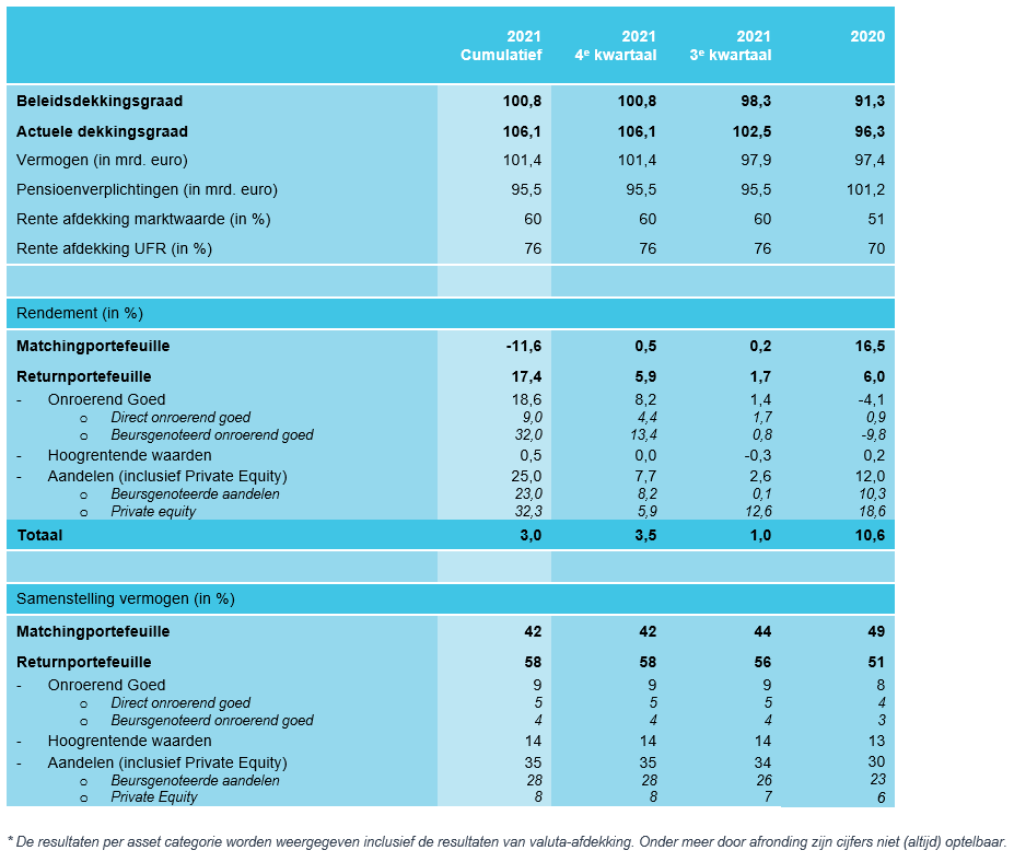 Het belegd vermogen steeg in het vierde kwartaal, met name door positieve rendementen binnen de risicodragende returnportefeuille. Onroerend goed kende in het vierde kwartaal een positief rendement van 8,2%. Ook aandelen behaalden een positief rendement van 7,7%. De hoogrentende beleggingen rendeerden licht negatief (afgerond 0,0%). De matchingportefeuille behaalde in het vierde kwartaal een positief resultaat van 0,5%. Het totaal beleggingsrendement over het vierde kwartaal van 2021 kwam daarmee uit op 3,5%. Het rendement over heel 2021 is 3,0%.